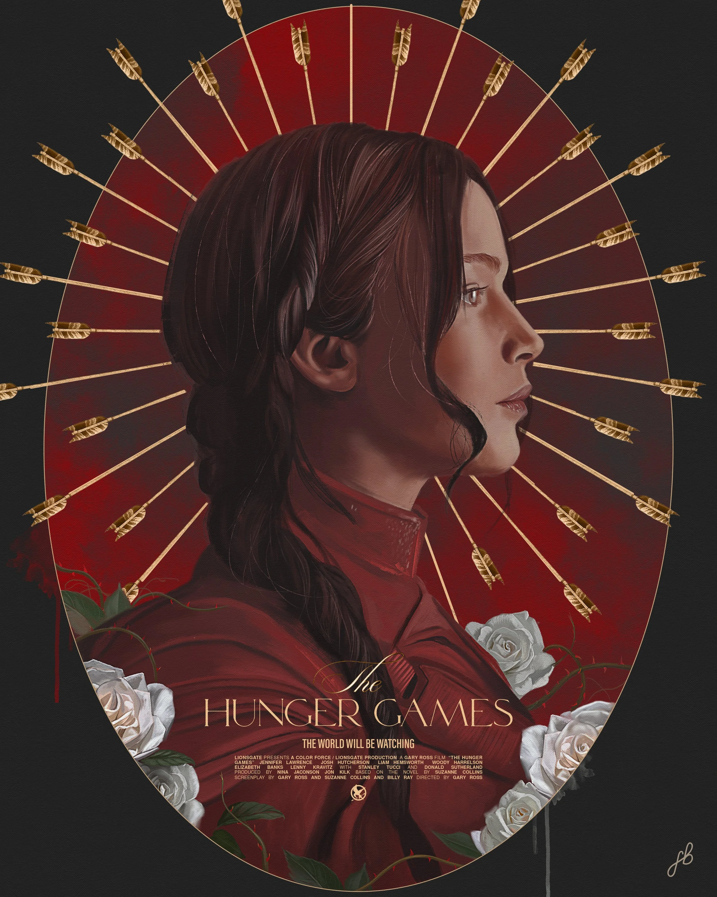 For this personal project, I reimagined Katniss Everdeen in a regal, side profile to emphasise her strength and resilience. The white roses and thorns encircling her symbolise President Snow and the oppressive hold he maintains over her life.