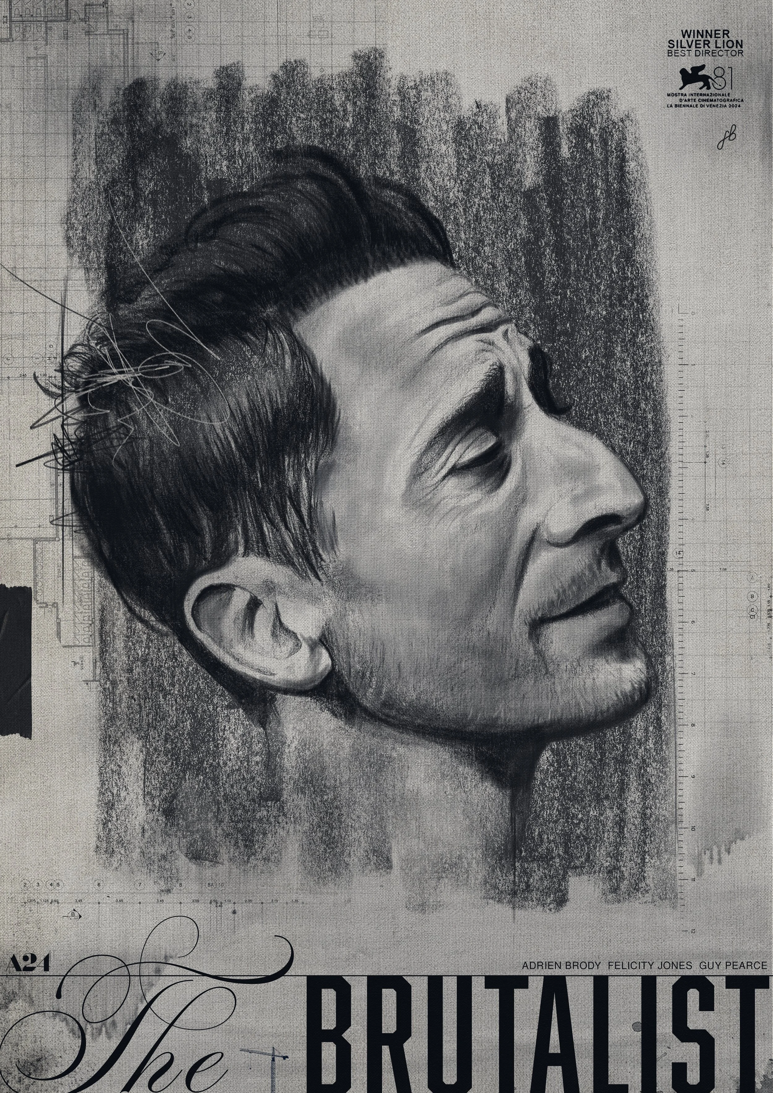 In this alternative film-poster tribute to The Brutalist, I returned to basics by beginning Adrien Brody’s portrait as a pencil drawing. I then scanned the sketch to evoke the look of an architect’s blueprint - complete with rough lines and scattered marks that mirror Laszlo Toth’s turbulent mental state during his time working as an architect for Harrison Lee Van Buren.